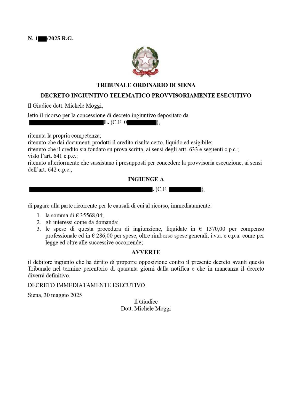 Siamo lieti di condividere un importante successo legale: il Tribunale di Siena ha emesso decreto ingiuntivo provvisoriamente esecutivo a favore della nostra assistita, per un importo pari a € 35.568,04, oltre interessi e spese.